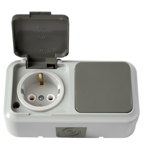 Блок В-РЦ-657(03) открытой установки 1 выключатель+розетка с заземлением IP54, ПРАЛЕСКА АКВА
