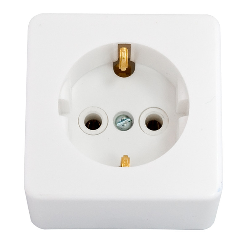 Розетка штепсельная одинарная с заземляющим контактом открытой установки.