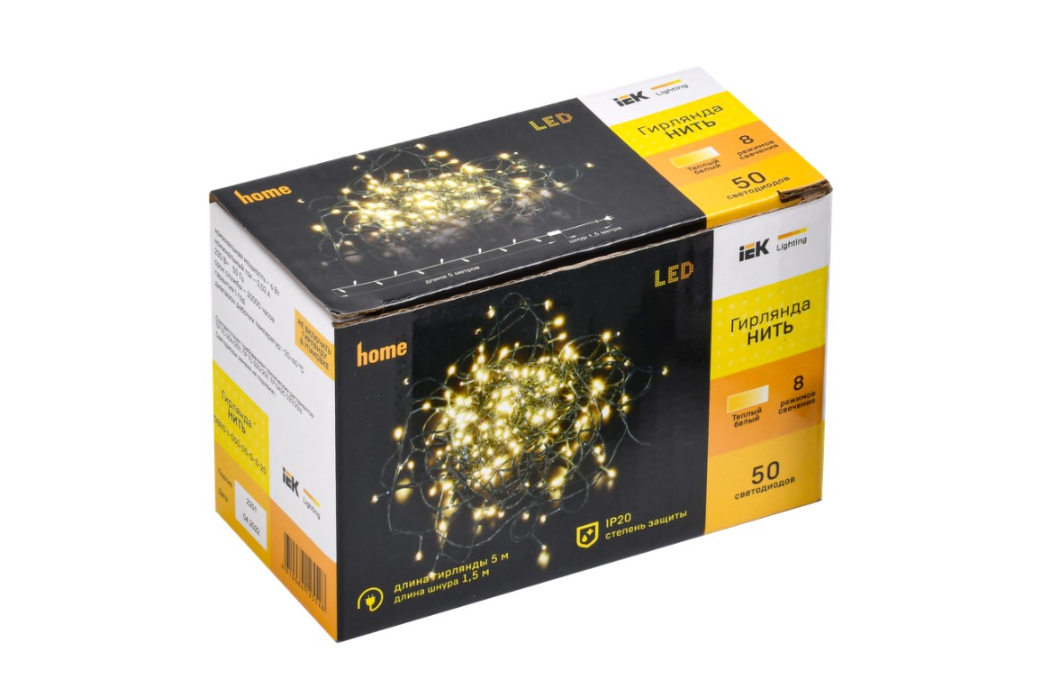 Гирлянда нить 5м 50 светодиодов теплый белый свет IP20 зеленый шнур 1,5м 230В контроллер 8 сцен IEK