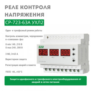 Контроль чередования, слипания фаз. Контроль нижнего (160 В) и верхнего (265 В) порогов напряжения. Асимметрия 20-80 В. контакт 1NO/NC.