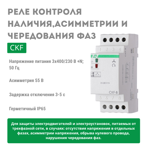 Автомат CKF предназначен для защиты элветродвигателей и электроустановок, питаемых от трехфазной сети, в случаях: отсутствия напряжения в отдельных фазах, асимметрии напряжения, обрыва нулевого провода, нарушения чередования фаз.