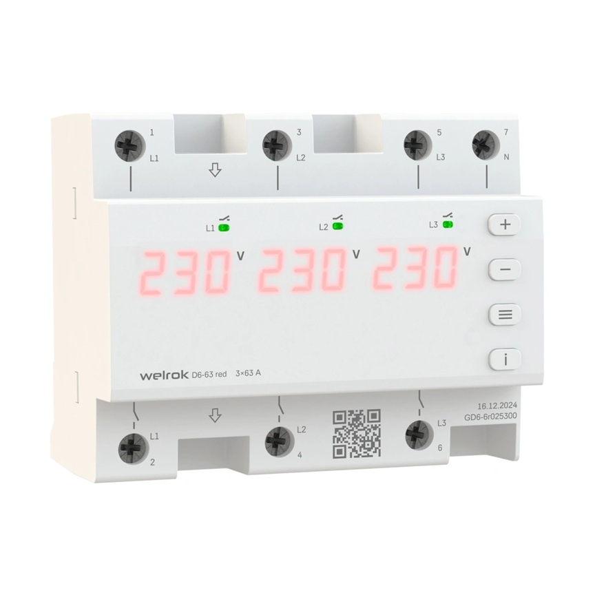 Реле напряжения Welrok D6 защищает электрооборудование от критических скачков напряжения в сети, занимает 6 модулей и может работать в режиме однофазной или трехфазной нагрузки.