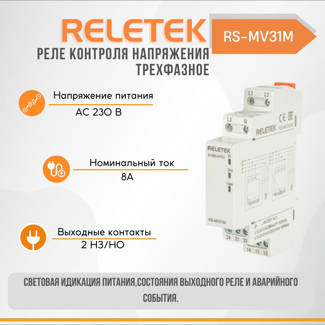 Реле контроля напряжения трехфазное RS-MV31M (3L, 8A, 2СO, Asy 8%, 2S OFF DELAY, LED INDICATOR: POWER/SEQ/FALLS)