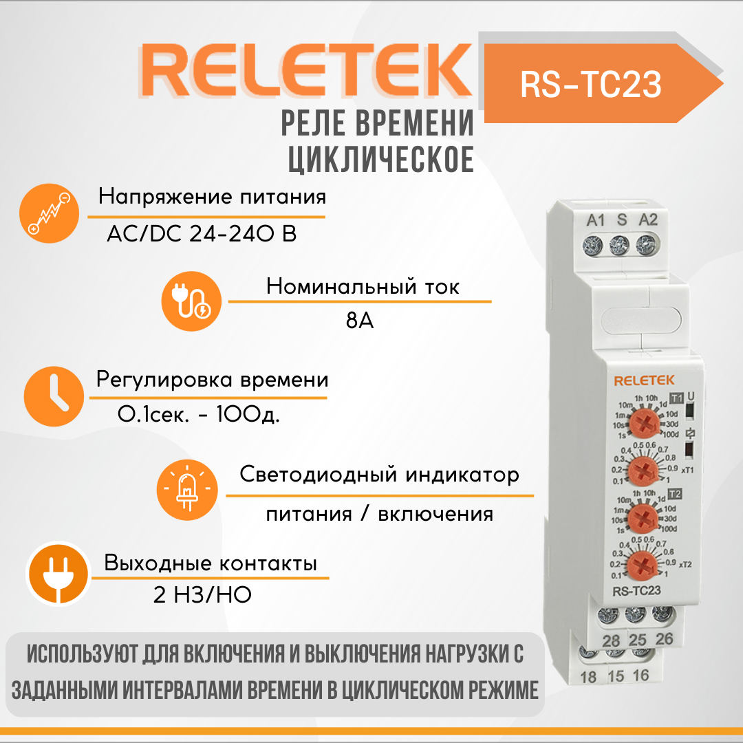 Реле времени циклическое RS-TC23 (24-240VAC/DC, 8A/230VAC, 2CO, 1S-100DAY)