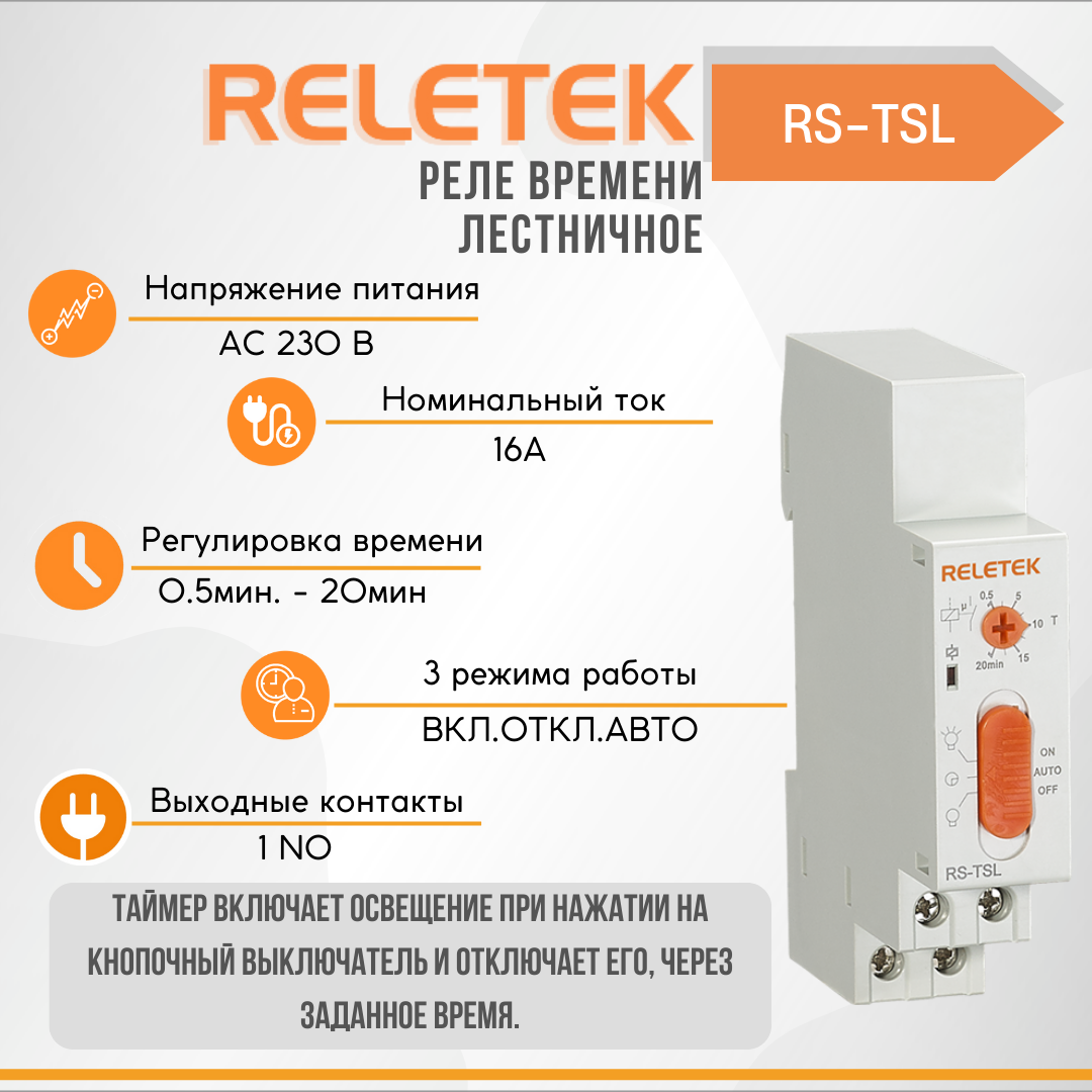 Реле времени лестничное RS-TSL (12-240VAC/DC, 16A/230VAC, 1NO, 0,5-20MIN)