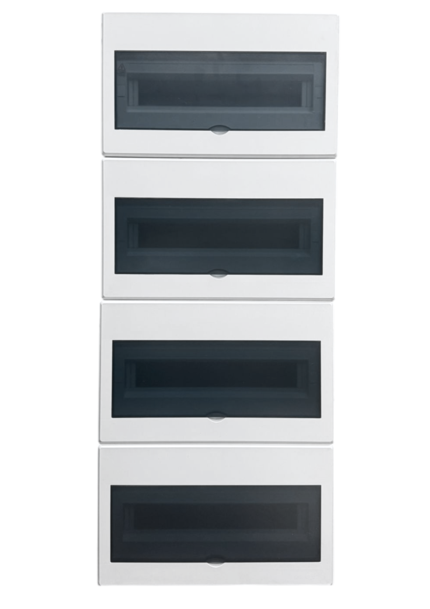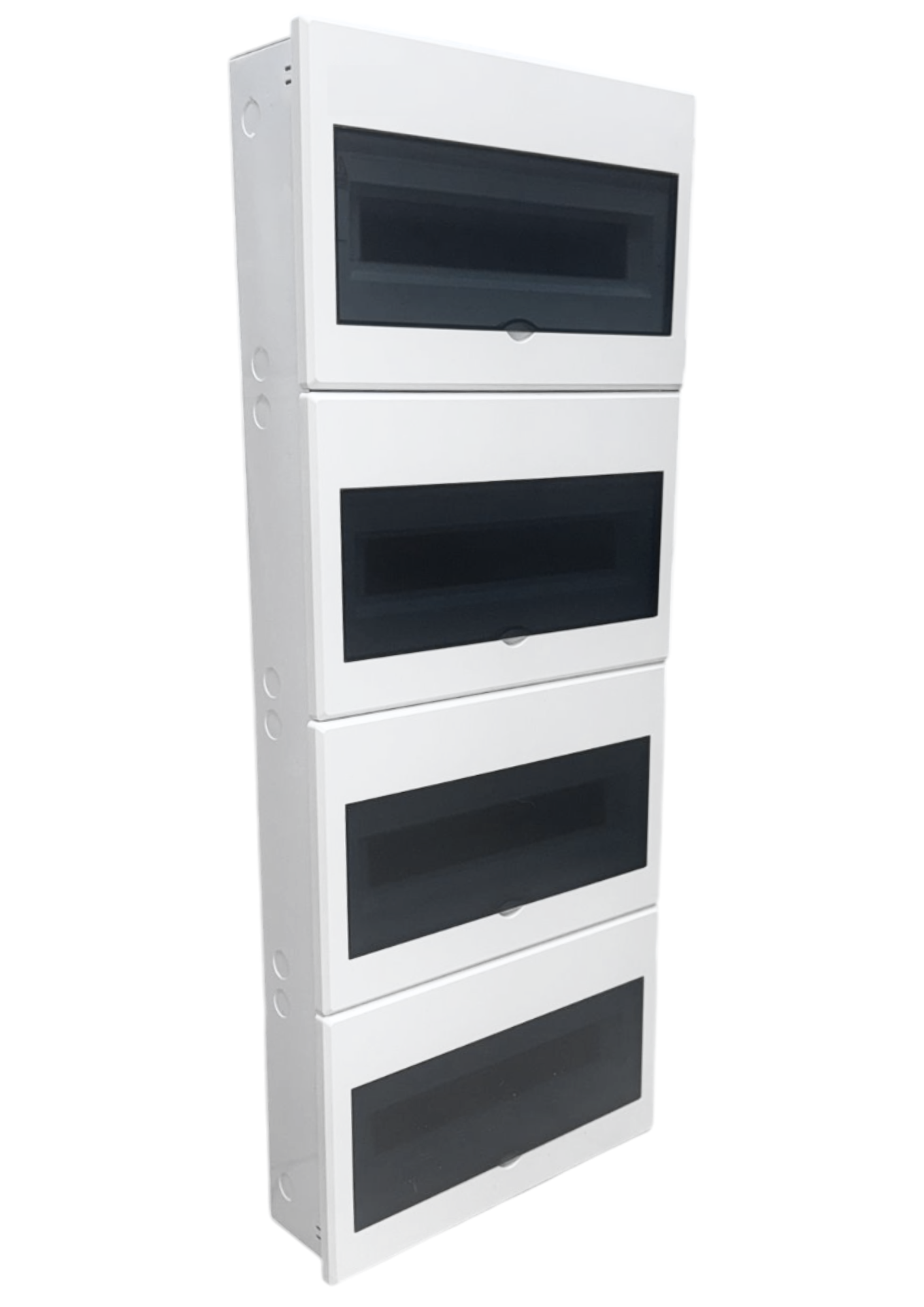 Щит распределительный встраиваемый, металлический корпус, пластиковая панель и окна.