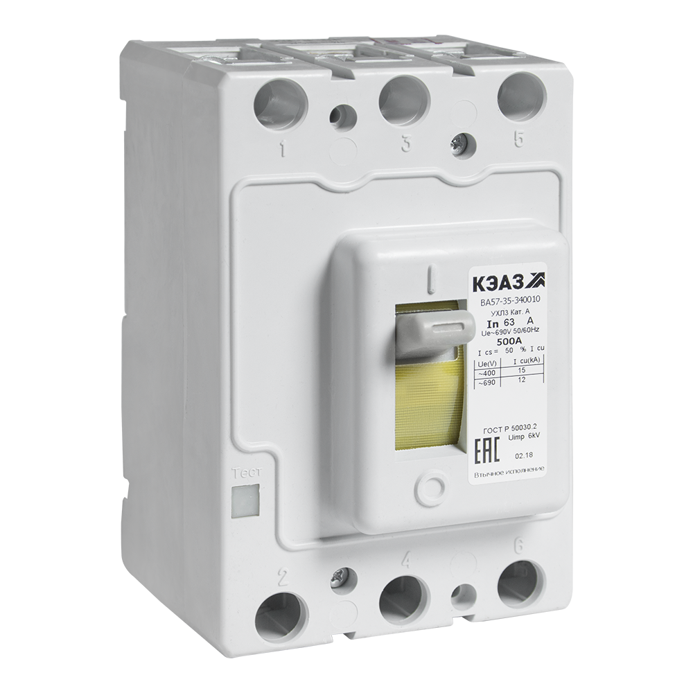 Трёхполюсные автоматические выключатели КЭАЗ серии ВА57-35 предназначены для эксплуатации в силовых электрических сетях с рабочим напряжением 400/690 В переменного тока частотой 50 и 60 Гц, а также в цепях постоянного тока 110/220/440 В. Устройства обеспечивают защиту оборудования и линий от токов короткого замыкания, перегрузок и недопустимого падения напряжения, а также рассчитаны на редкие оперативные включения и отключения в процессе эксплуатации.
