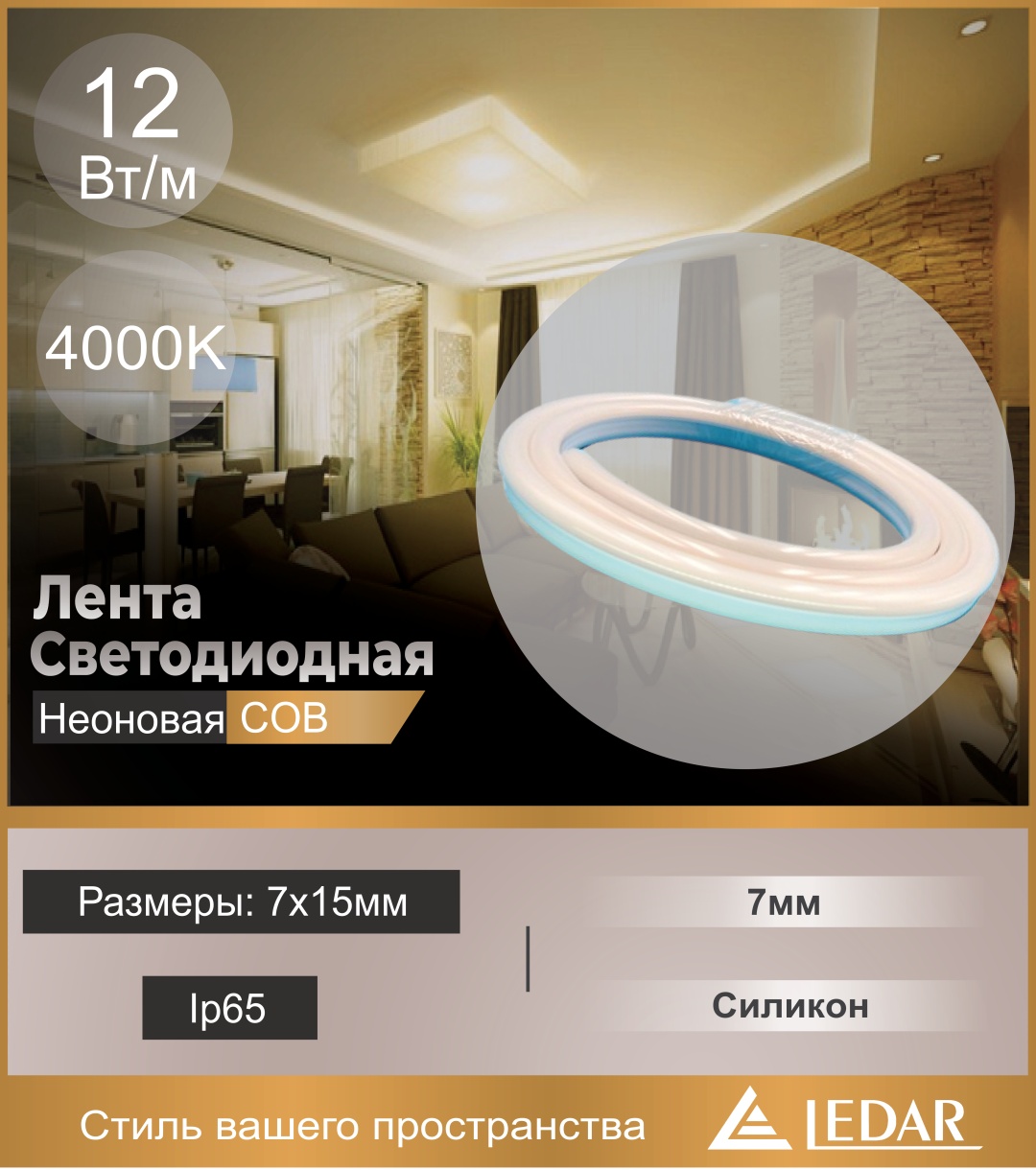 Лента светодиодная неоновая COB 7х15мм 220V 12Вт/м 4000K IP65 силикон LEDAR