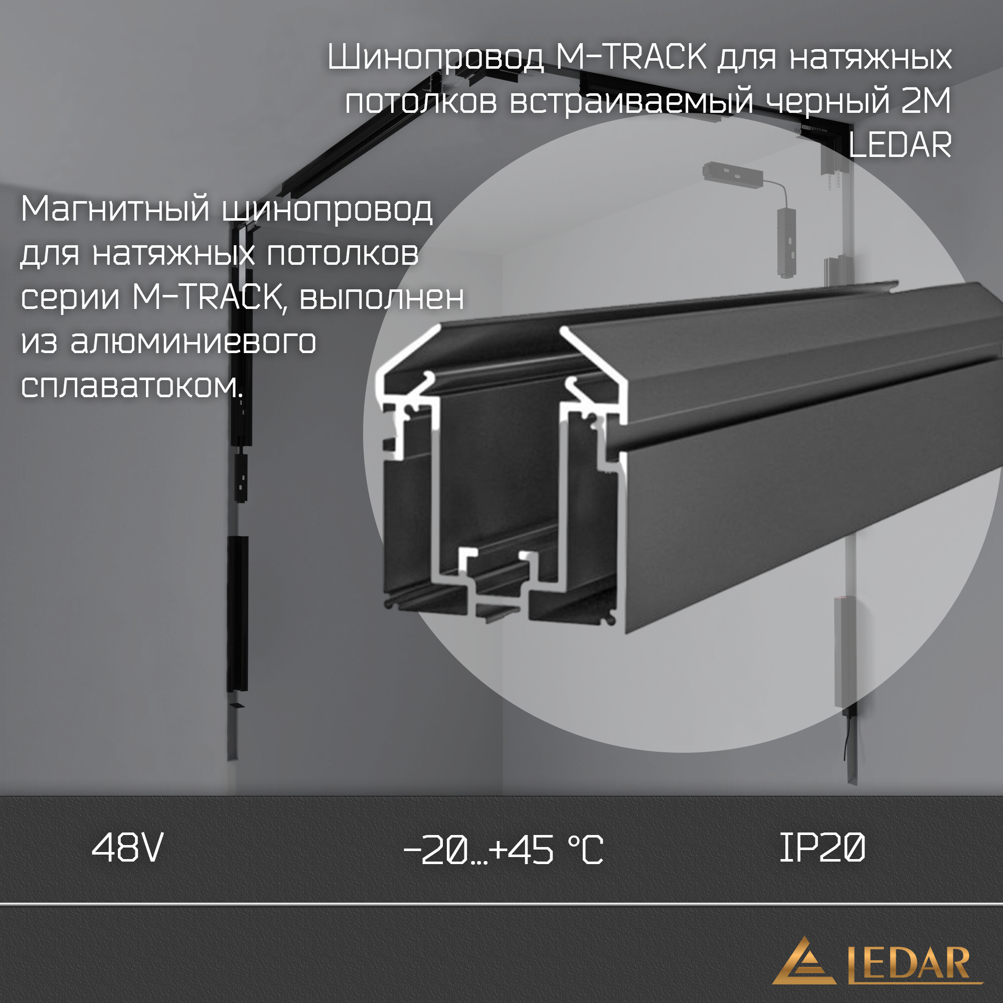 Магнитный шинопровод для натяжных потолков серии M-TRACK черный, длина 2м, на напряжение 48V, выполнен из алюминиевого сплава, диапазон рабочих температур -20 ... +45 °C, защита IP20, торговой марки LEDAR® - законченное трековое решение для организации функционального и декоративного освещения в жилых и офисных пространствах. Система адаптирована под гарпунный метод крепления натяжного потолка. Сцены освещения устанавливаются простым перемещением магнитных светильников. Система позволяет формировать конструкции произвольной формы - допускается рез профиля в произвольном месте под требуемым углом. Высокая жесткость алюминиевого корпуса исключит деформации при монтаже полотна, а низковольтное питание в 48В обезопасит от поражения током.