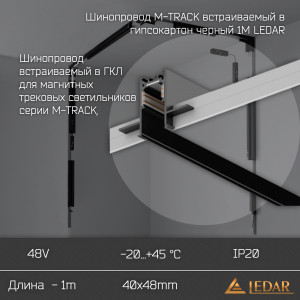 Шинопровод встраиваемый для магнитных трековых светильников серии M-TRACK, черный, длина 1м, на напряжение 48V, выполнен из алюминиевого сплава, диапазон рабочих температур -20 ... +45 °C, защита IP20, размер 40х48мм торговой марки LEDAR®