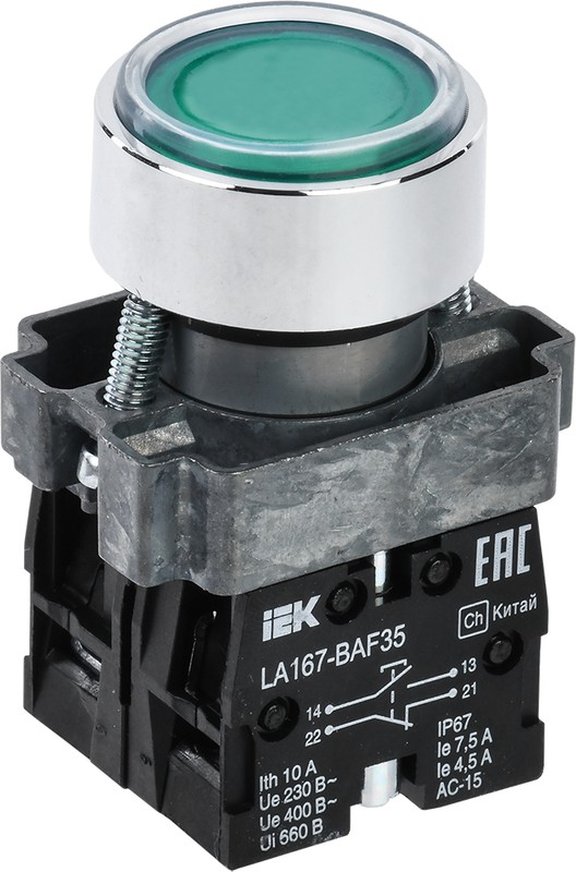 Кнопка LA167-BAF35 d=22мм 1NO+1NC зеленая IEK