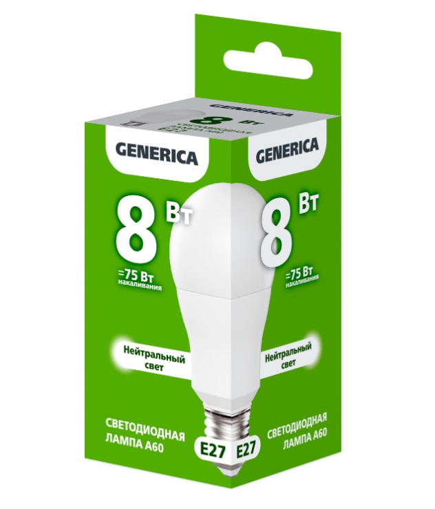 Лампа LED A60 груша 8Вт 230В 4000К E27 GENERICA