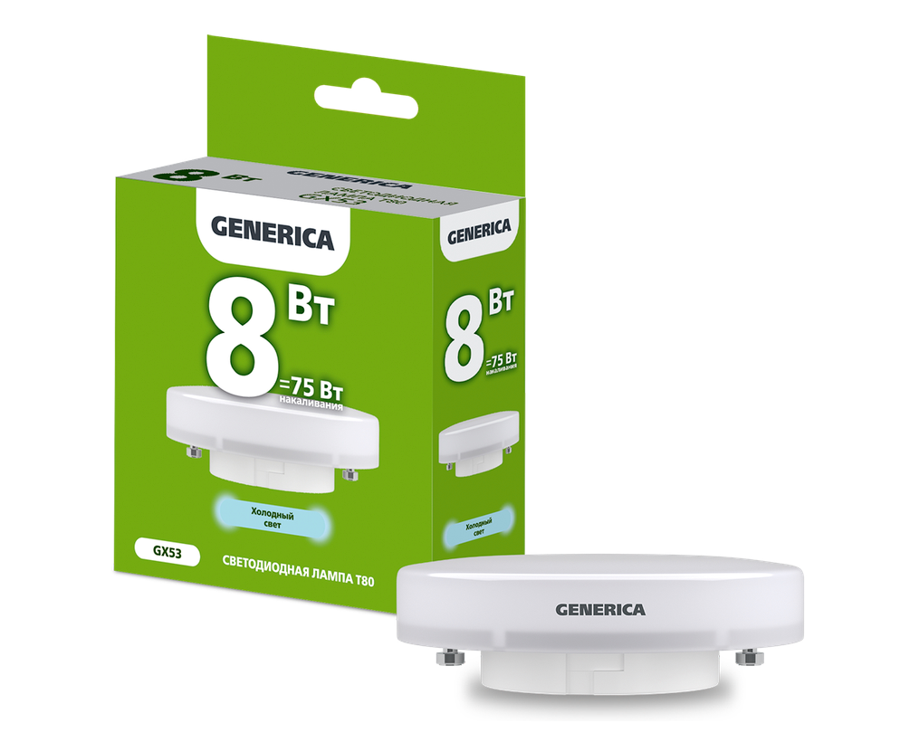 Лампа LED T80 таблетка 8Вт 230В 6500К GX53 GENERICA