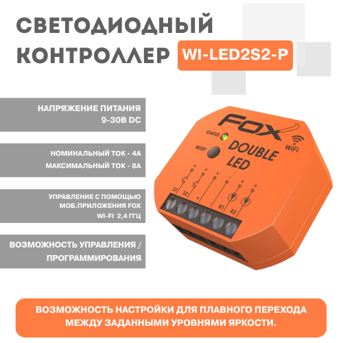 Двухканальный драйвер светодиодного освещения с питанием от постоянного тока 9–30 В обеспечивает возможность плавного перехода между заданными уровнями яркости. Контроллер рассчитан на работу с напряжением 12/24 В и поддерживает нагрузку до 4 А на каждый канал. Для каждого канала возможно подключение локальной кнопки для включения и выключения света (короткое нажатие), а также для регулировки яркости (длительное нажатие). Уровень яркости может задаваться через мобильное приложение или с помощью программируемых таймеров. Встроенные часы с резервным питанием и копия рабочей программы обеспечивают стабильную работу устройства даже при отсутствии подключения к Wi-Fi. Контроллер поддерживает REST API для интеграции с другими системами домашней автоматизации. Встроенная тепловая защита обеспечивает безопасность эксплуатации. Устройство удобно устанавливается в стандартную монтажную коробку диаметром 60 мм. Нагрузочную способность выходов можно увеличить с использованием дополнительных усилителей LED-AMP-1P или LED-AMP-1D.
