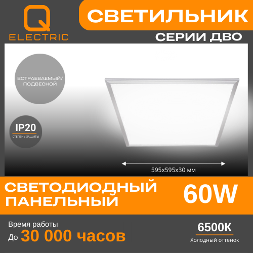 Светильник светодиодный панельный ДВО 60W 6500K 595х595х30мм со встроенным драйвером, встраиваемый/подвесной, алюминиевая рамка, белый QEL