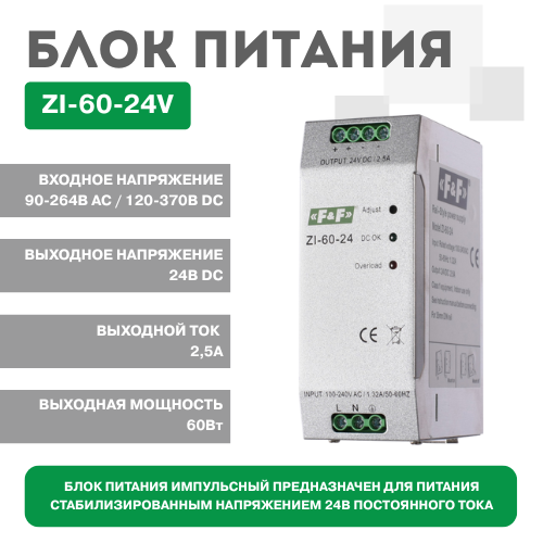 Импульсный стабилизатор. Входное напряжение 90-264В AC / 120-370В DC. Выходное напряжение 24В DC. Выходная мощность 60Вт.
