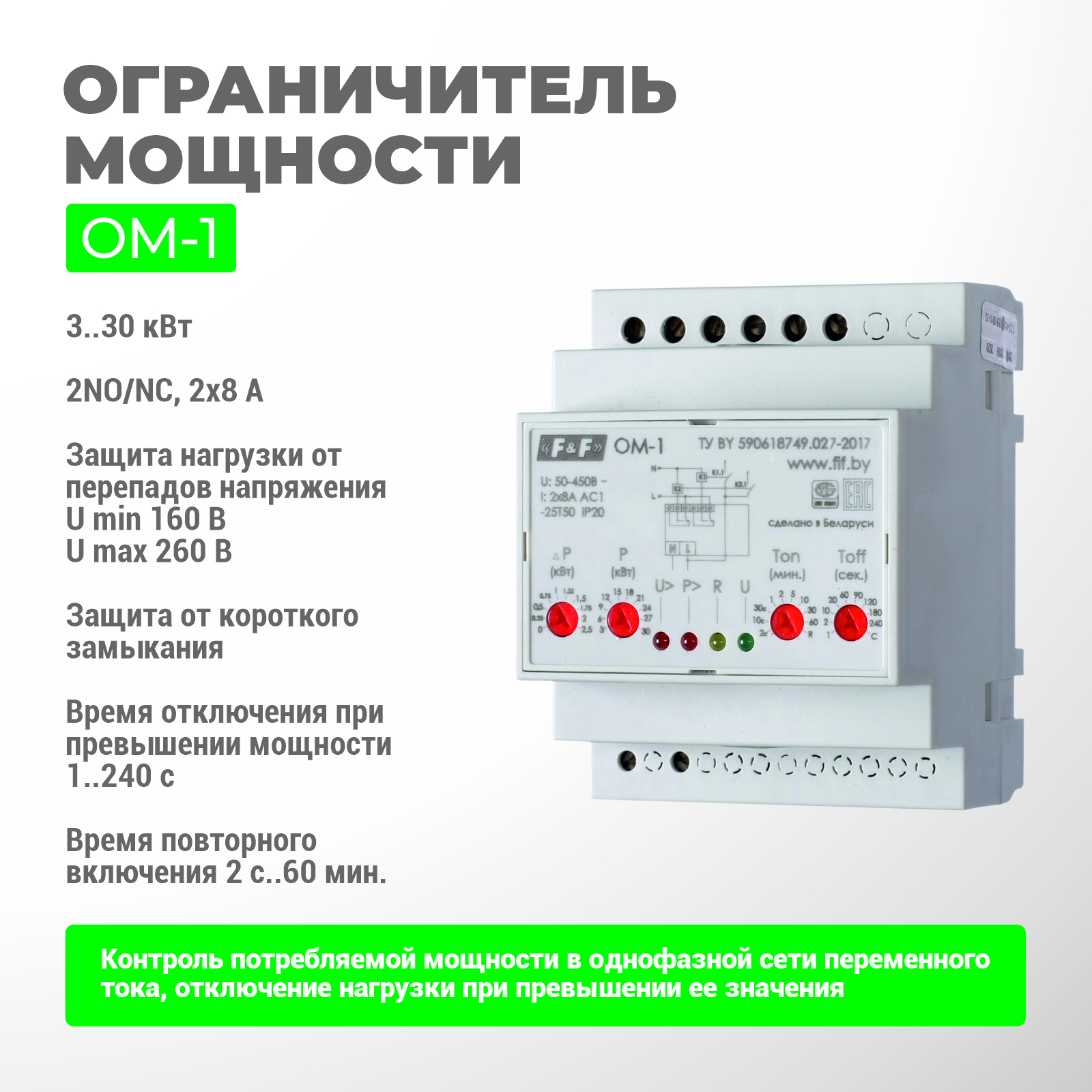 Для контроля потребления электрооборудованием мощности в однофазной сети переменного тока. Обеспечивает отключение нагрузки от сети питания при превышении установленного значения мощности или коротком замыкании в нагрузке, а так же при повышении, либо понижении напряжения в питающей сети.