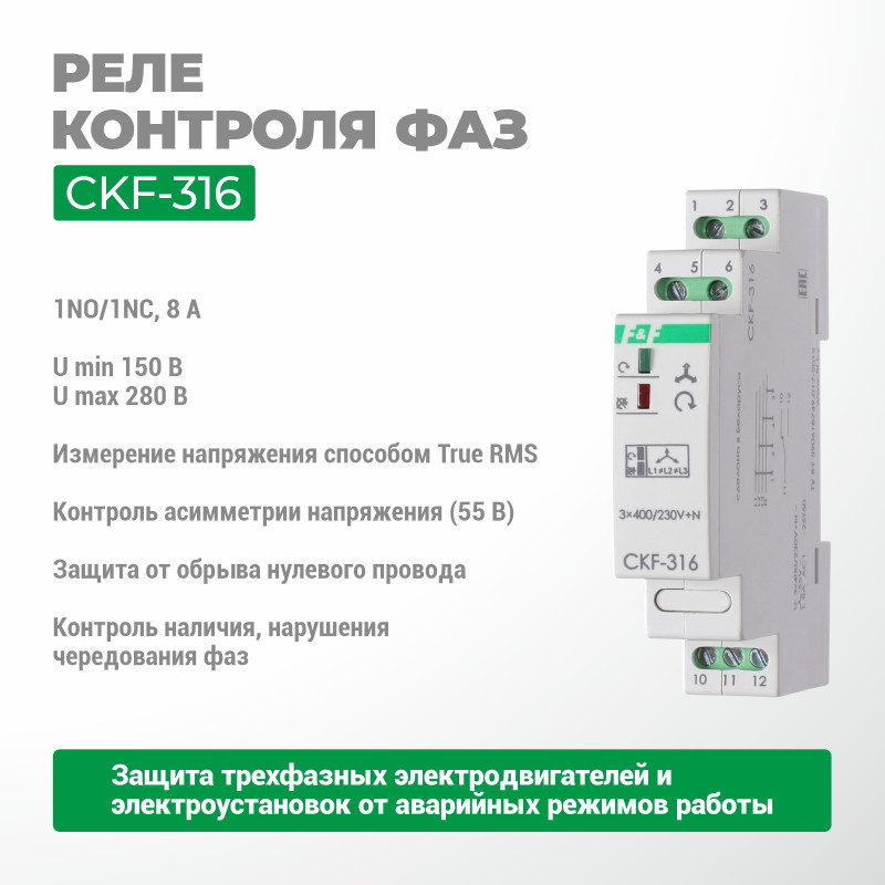 Реле контроля фаз CKF-316 предназначено для защиты электродвигателей и электроустановок, подключенных к трёхфазной сети, в случаях: