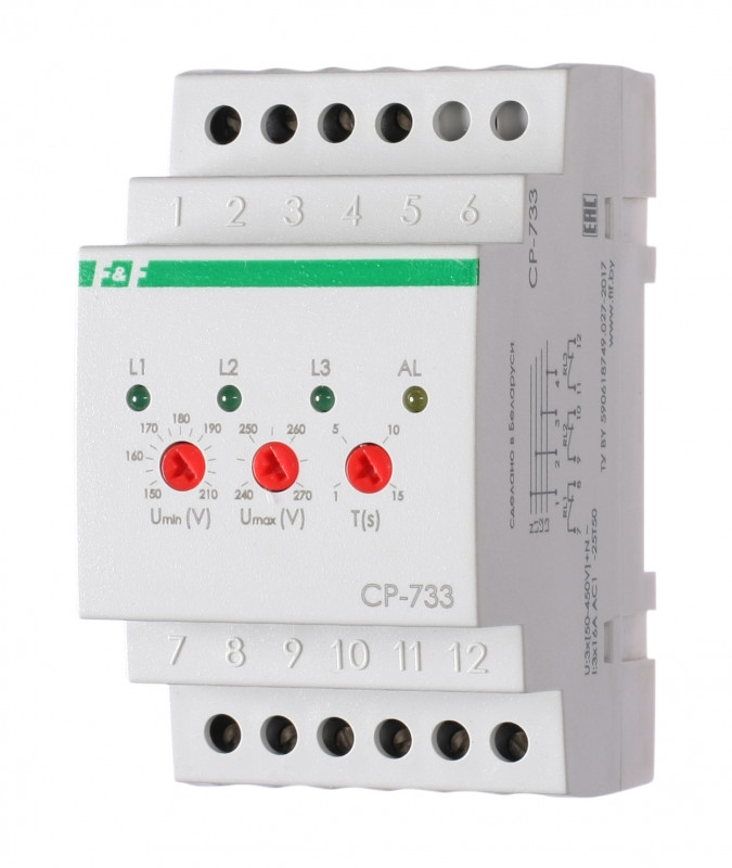 Нижний предел 150-210 В, Верхний предел 240-270 В, отдельный контакт на каждую фазу контакт 3NC, 3х16 А.
