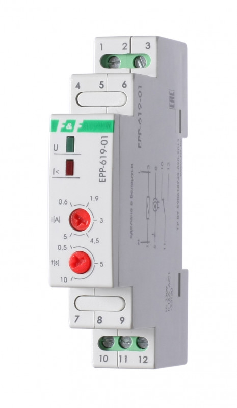 - напряжение питания 230 В, 50 Гц; - диапазон контролируемых токов 0,6…5 А; - задержка отключения (регулируемая) 0,5…10 с.