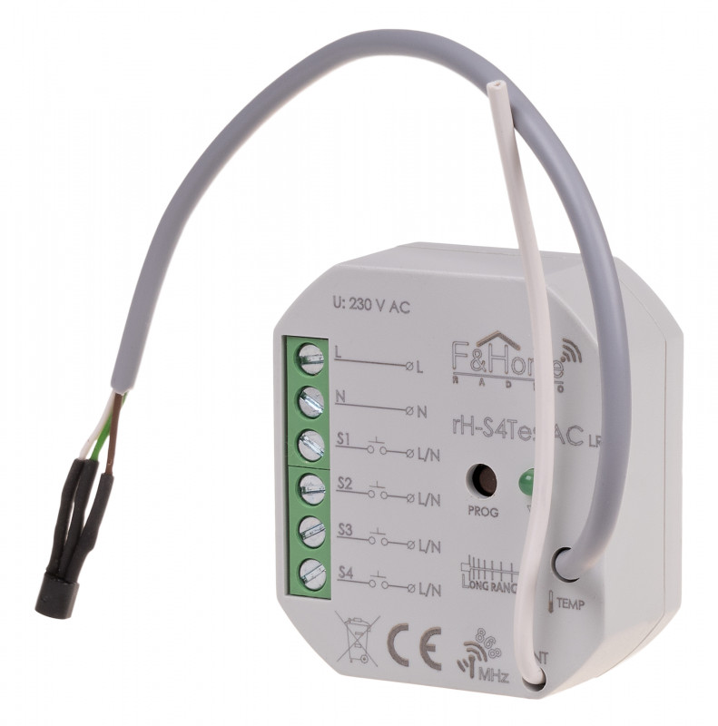 Передатчик rH-S4Тes AC LR предназначен для управления в системах освещения, отопления, затопления, идеально подходит для подключения выключателей, различных датчиков (затопления, герконов, задымления) и концевых выключателей. Модули версии LR отличаются увеличенной дальностью радиосвязи, которая составляет на открытом пространстве до 350 м. Дальность до 350 м достигается при работе в комплекте с серверами rH-SERVER LR и rH-SERVER DIN2.