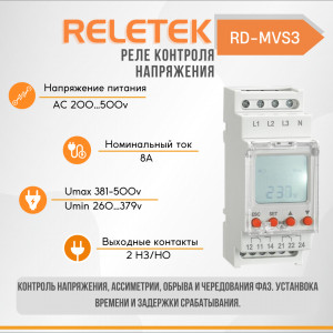 Реле контроля напряжения трехфазное трехпроводное RS-MV33P (3L, 10Un=208-480V, 8A, 1СO, Asy 5-20%, 0,1-10S OFF DELAY, LED INDICATOR: POWER/ASY/FALL)