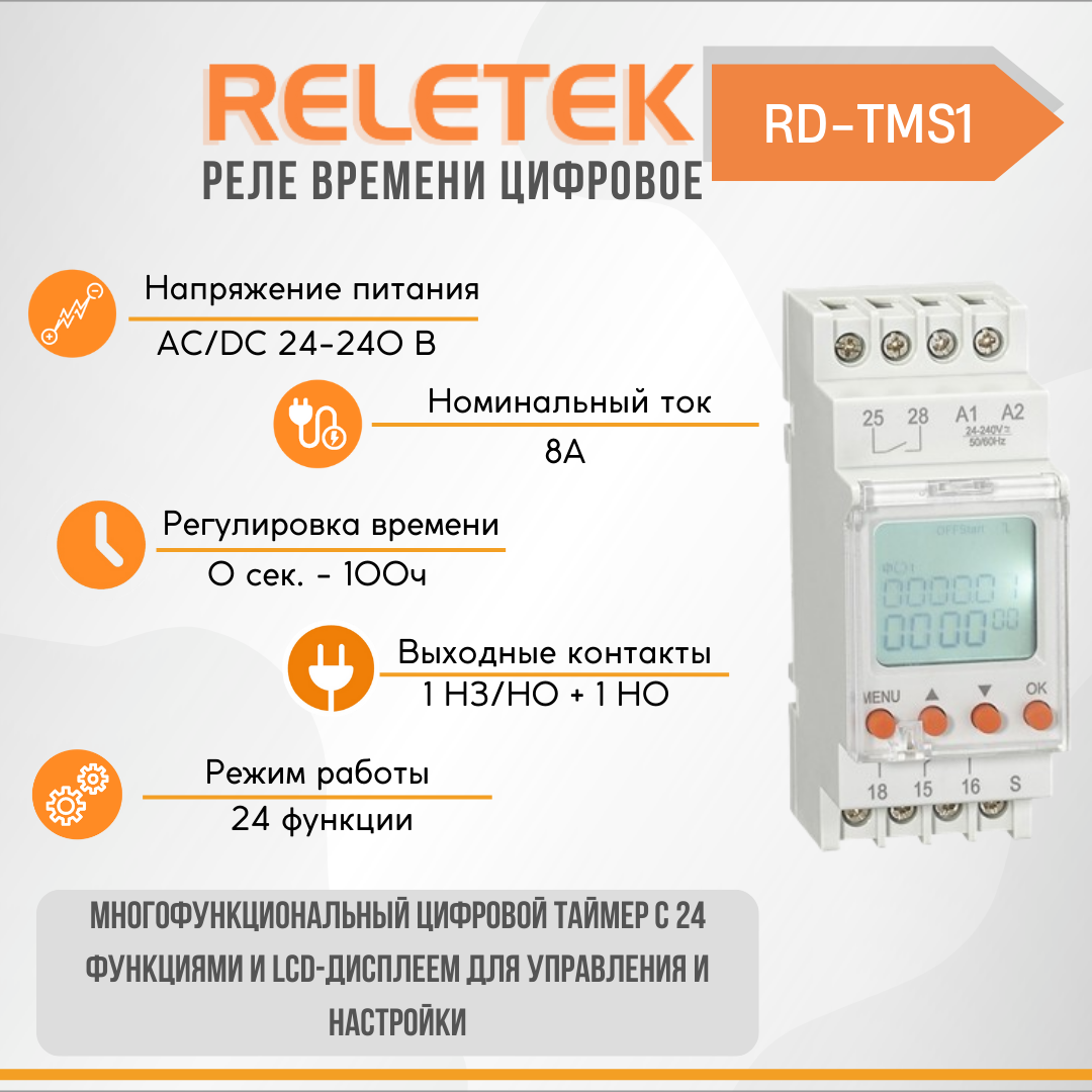Реле времени многофункциональное цифровое RD-TMS1 (LCD, 24 FUNC, MEMORY 10 YEARS, 24-240VAC/DC, 8A/230VAC, 1CO+1NO, T: 0S-100H)