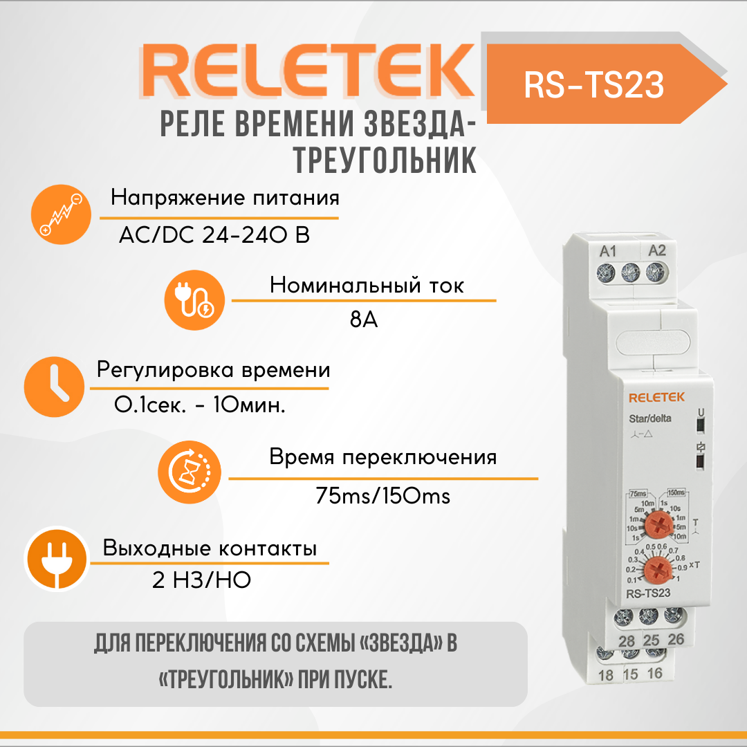 Реле времени звезда-треугольник RS-TS23 (24-240VAC/DC, 8A/230VAC, 2CO, T1: 0,1S-10MIN, T2: 75/150 ms)