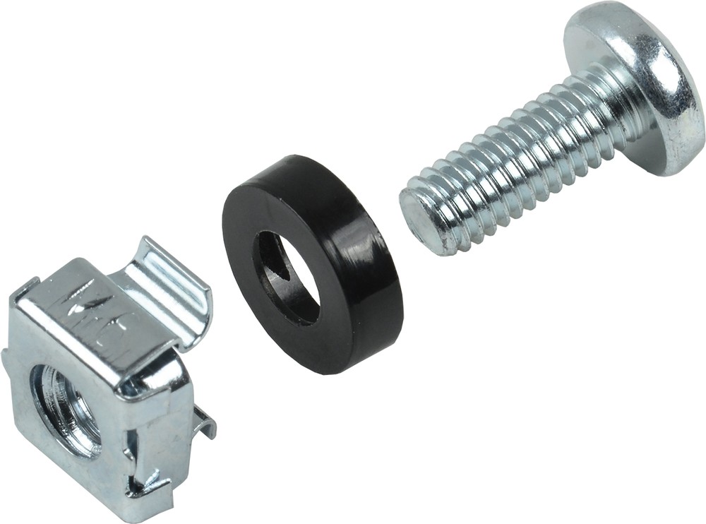Гайки в наборе имеют квадратную форму и специальные "лапки", прочно фиксирующие их в квадратном отверстии монтажных профилей, что облегчает установку оборудования, т.к. нет необходимости держать гайку руками. Также в наборе предусмотрены пластиковые шайбы, предотвращающие повреждение оборудования при затягивании винтов в гайку.