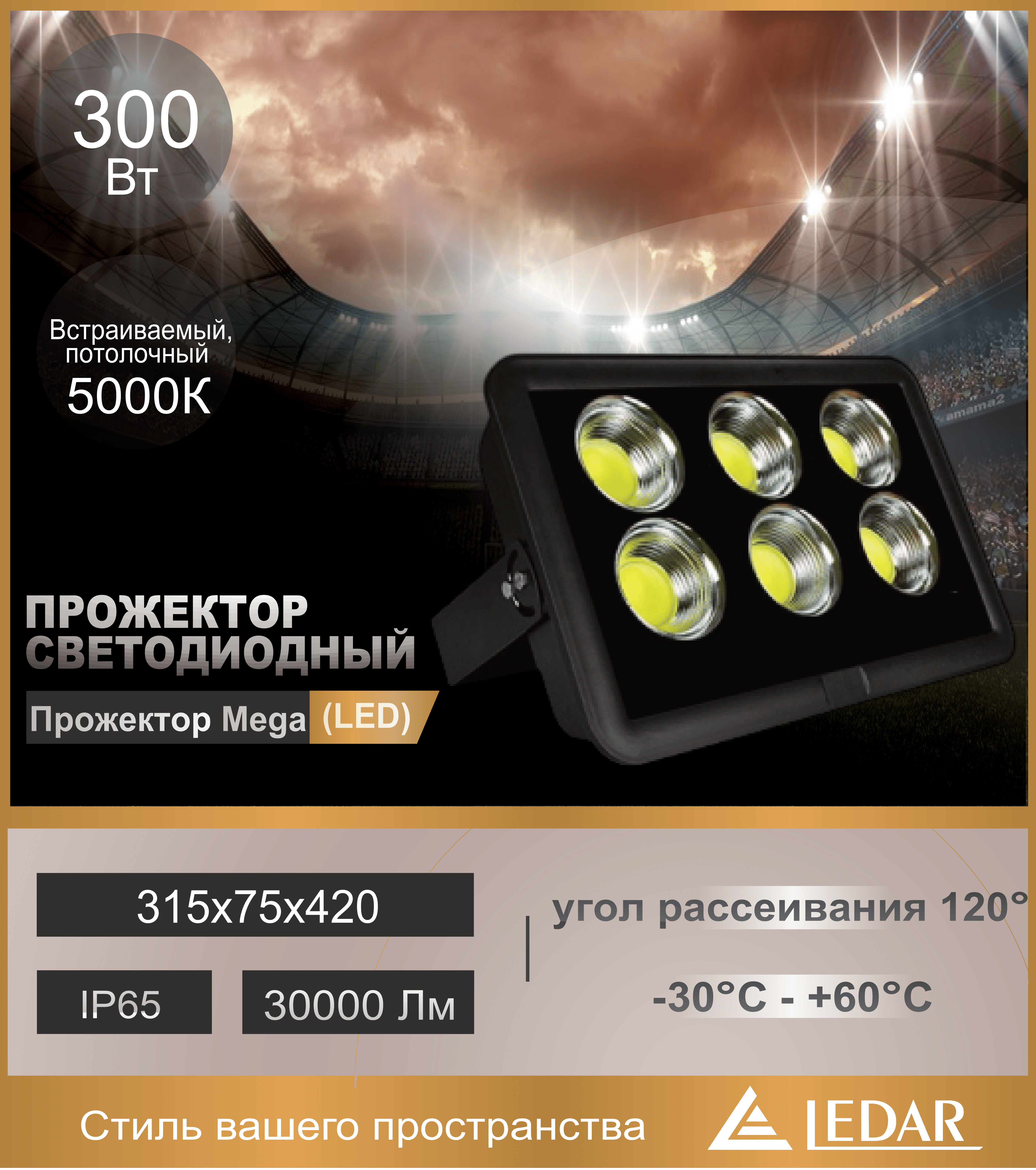 LED ПРОЖЕКТОР MEGA 300W 30000Lm 5000K IP65 LEDAR