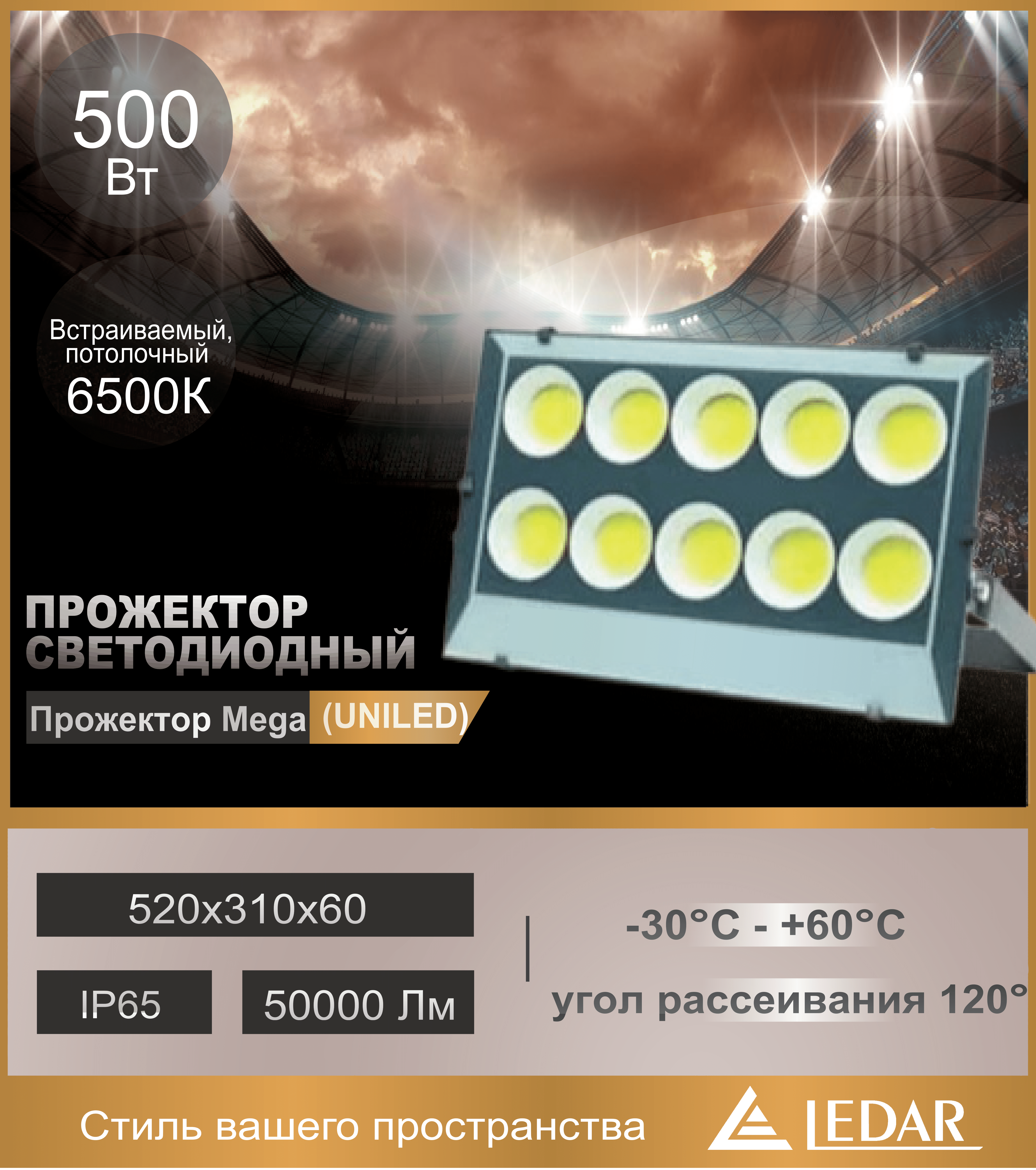 LED ПРОЖЕКТОР UNILED 500W 50000Lm 520х310х60 6500K IP65 LEDAR