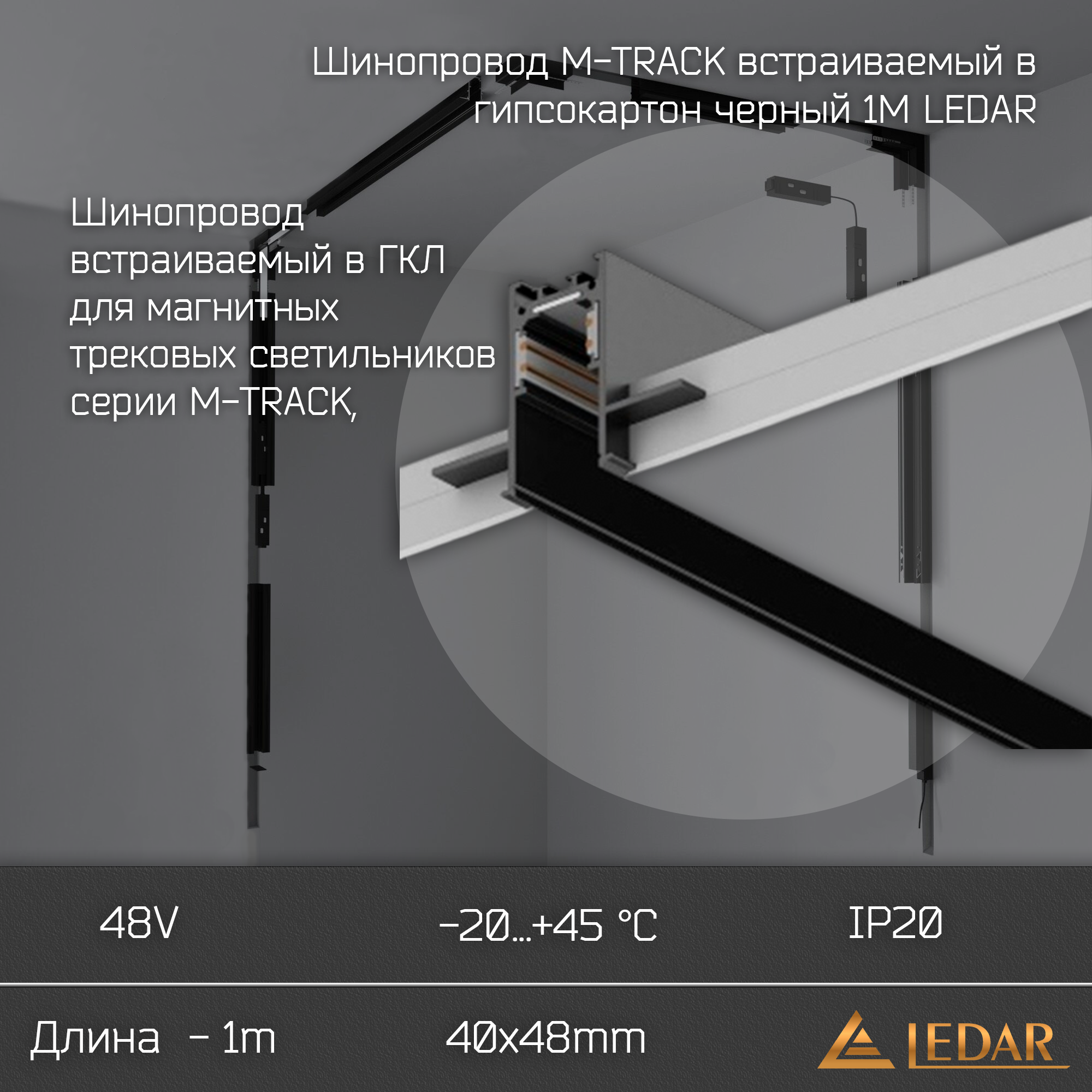 Шинопровод M-TRACK встраиваемый в гипсокартон черный 1М LEDAR