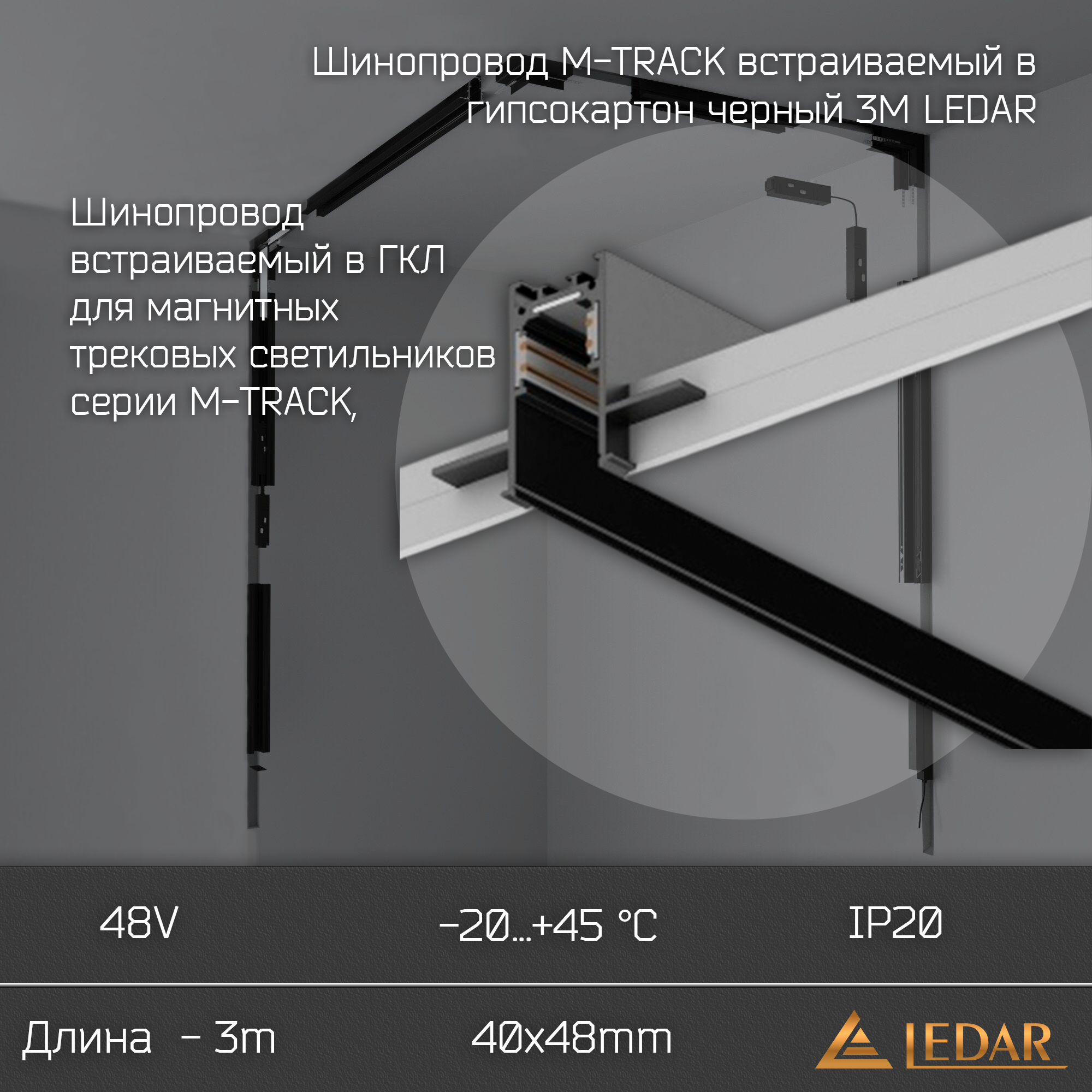 Шинопровод M-TRACK встраиваемый в гипсокартон черный 3М LEDAR