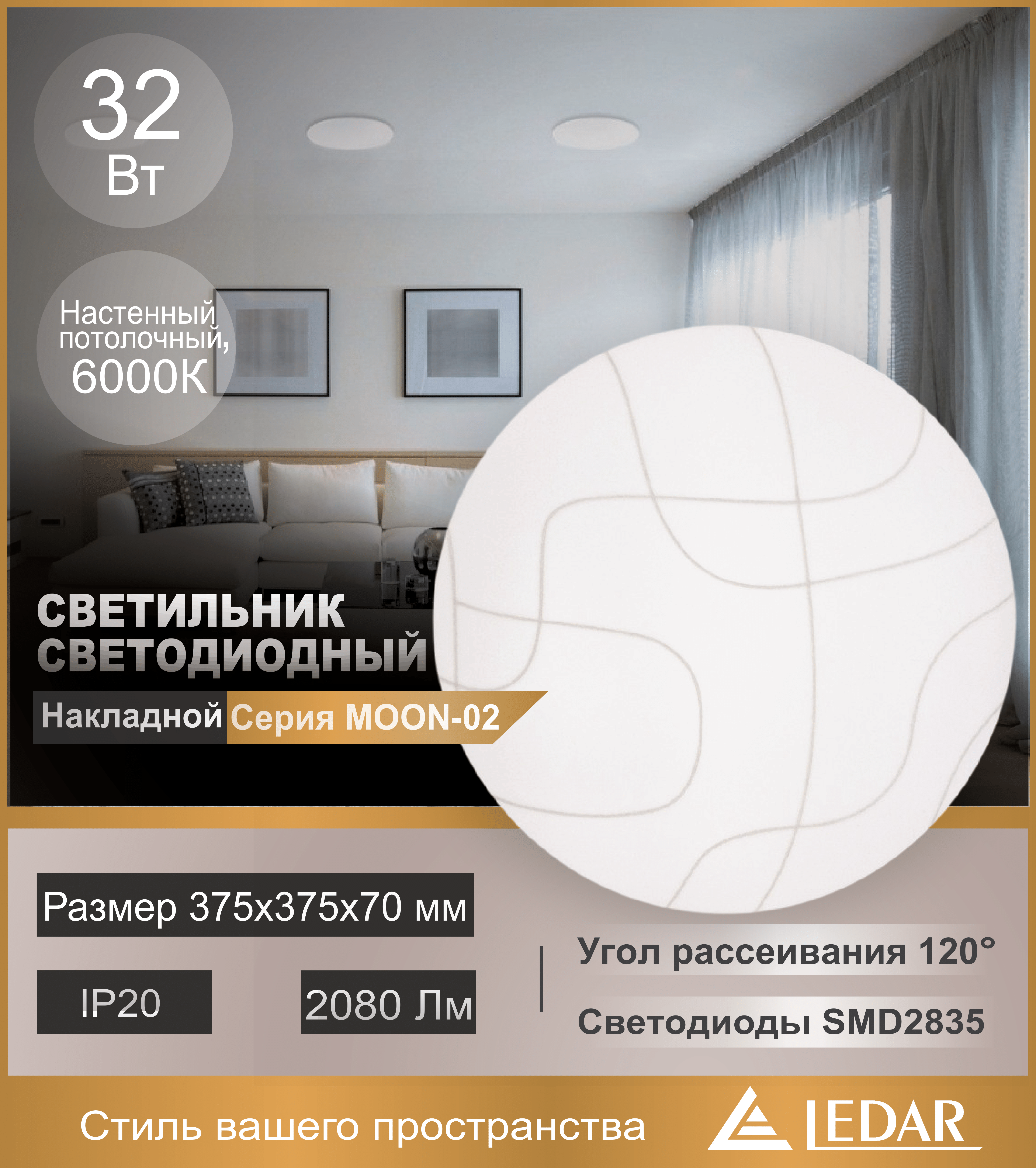 Светильник накладной (настенный, потолочный) светодиодный с оригинальным узором на рассеивателе, специальной линзой для обеспечения равномерной засветки плафона и органичным дизайном плафона, который впишется в любой стиль помещения, серия MOON-02 (ДПБ) торговой марки LEDAR®, 32W, 6000К (дневной белый), 220-240V, 2080Lm, IP20, угол рассеивания 120°, тип светодиодов SMD2835, цвет белый с узором, корпус - пластик, рассеиватель - металл, размер 375x375x70 мм