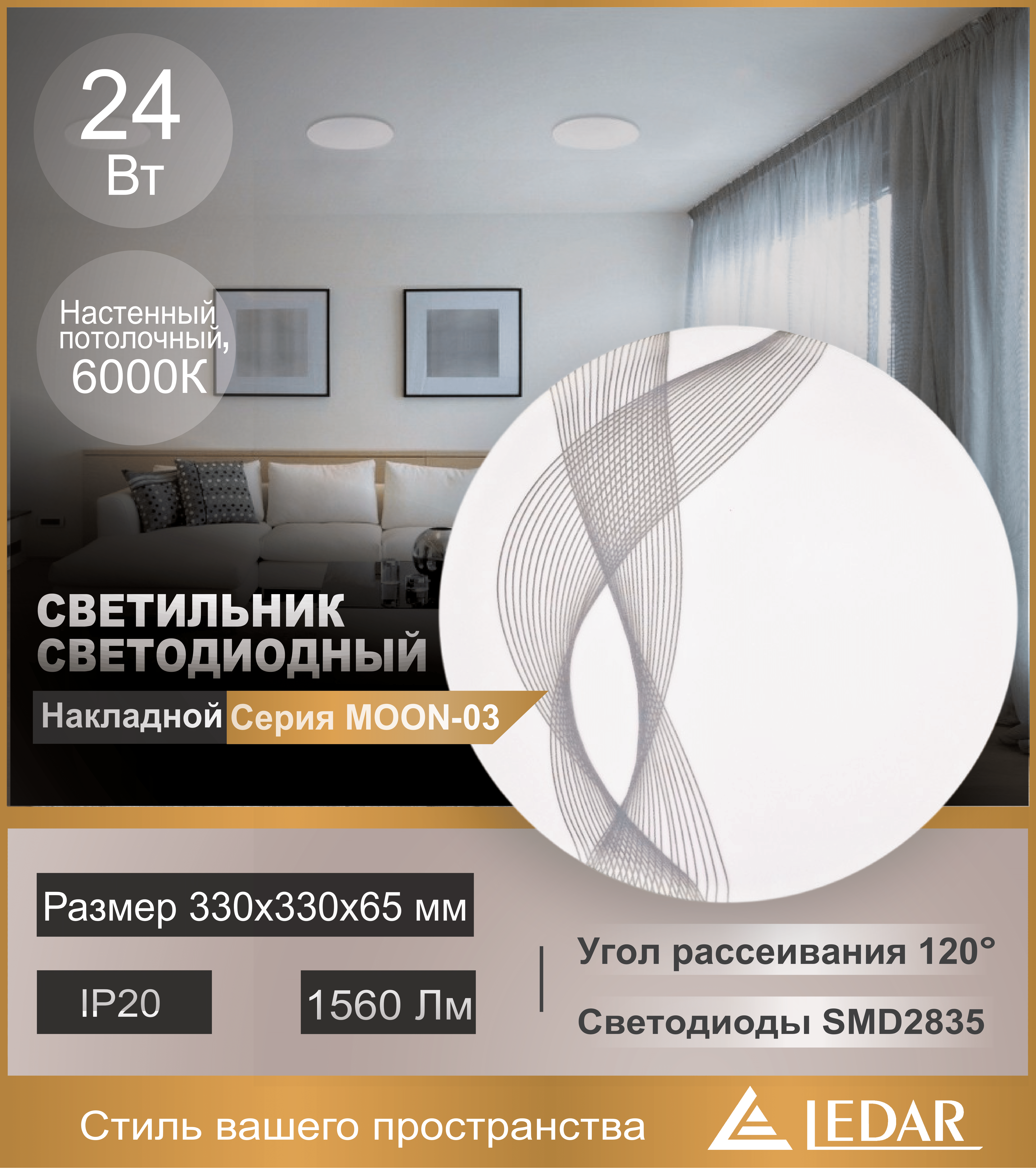 Светильник накладной (настенный, потолочный) светодиодный с оригинальным узором на рассеивателе, специальной линзой для обеспечения равномерной засветки плафона и органичным дизайном плафона, который впишется в любой стиль помещения, серия MOON-03 (ДПБ) торговой марки LEDAR®, 24W, 6000К (дневной белый), 220-240V, 1560Lm, IP20, угол рассеивания 120°, тип светодиодов SMD2835, цвет белый с узором, корпус - пластик, рассеиватель - металл, размер 330x330x65 мм