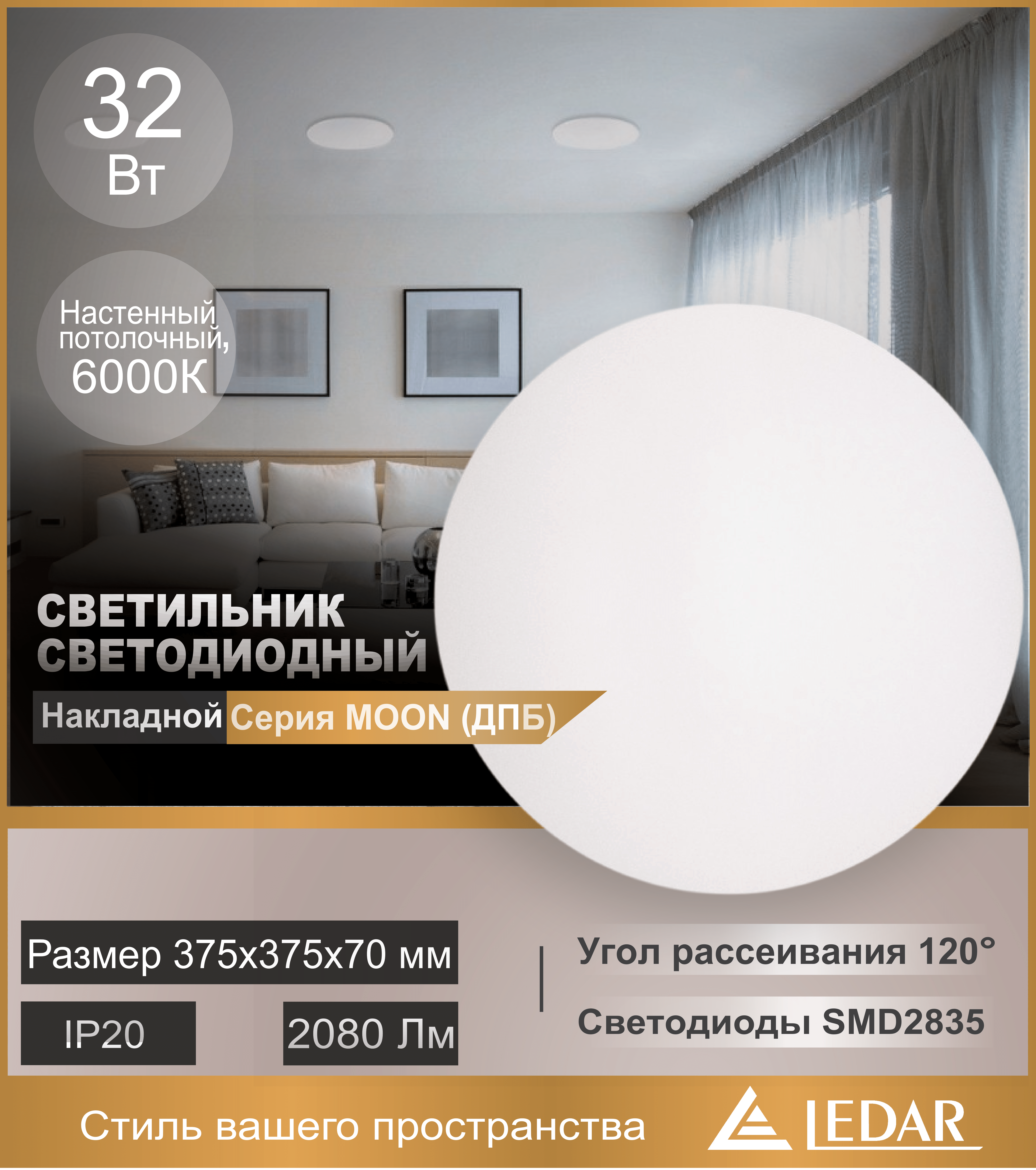 Светильник накладной (настенный, потолочный) светодиодный, серии MOON (ДПБ) торговой марки LEDAR®, 32W, 6000К (дневной белый), 220-240V, 2080Lm, IP20, угол рассеивания 120°, тип светодиодов SMD2835, цвет белый, корпус - пластик, рассеиватель - металл, размер 375x375x70 мм