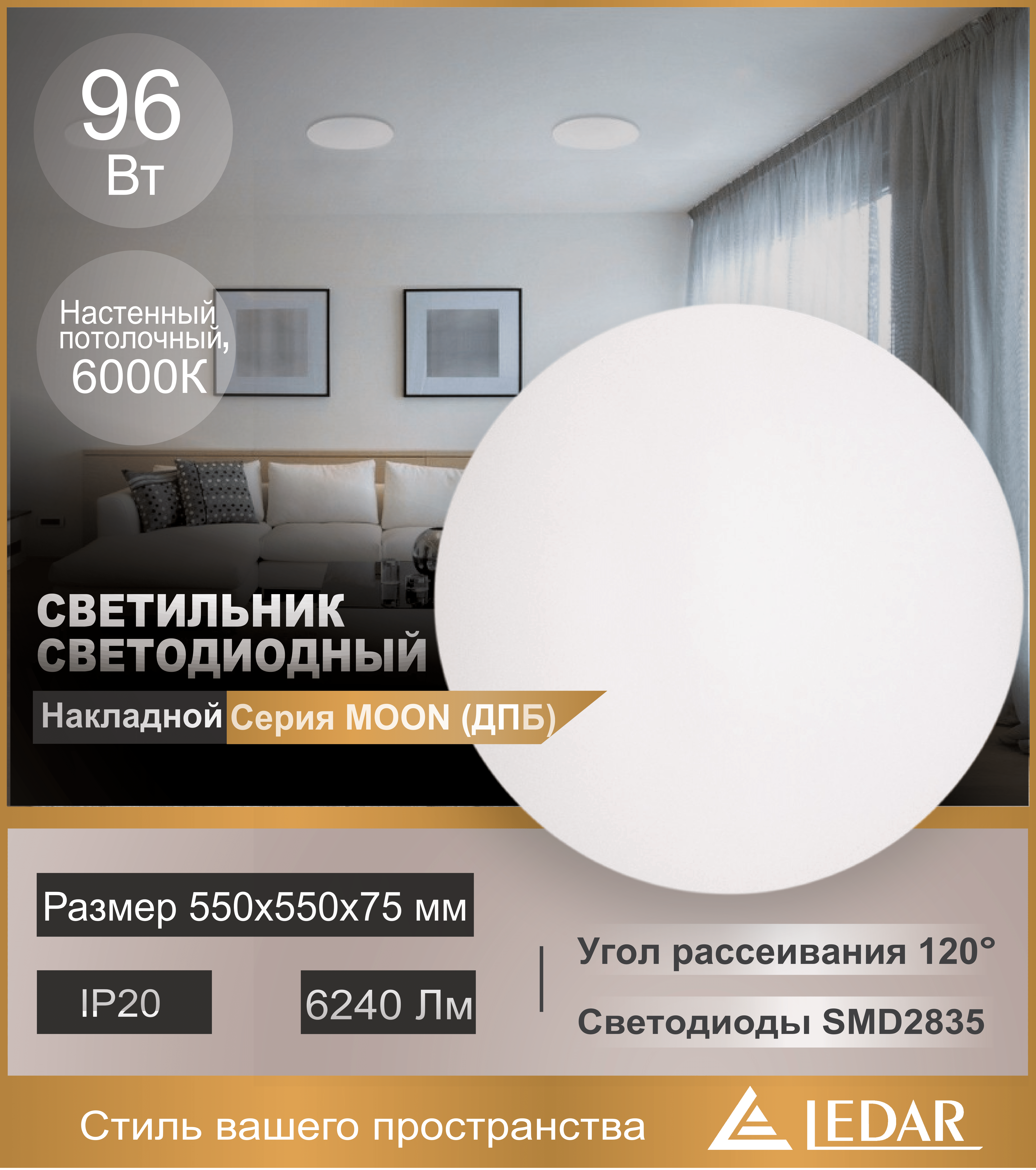 Светильник накладной (настенный, потолочный) светодиодный, серии MOON (ДПБ) торговой марки LEDAR®, 96W, 6000К (дневной белый), 220-240V, 6240Lm, IP20, угол рассеивания 120°, тип светодиодов SMD2835, цвет белый, корпус - пластик, рассеиватель - металл, размер 550x550x75 мм