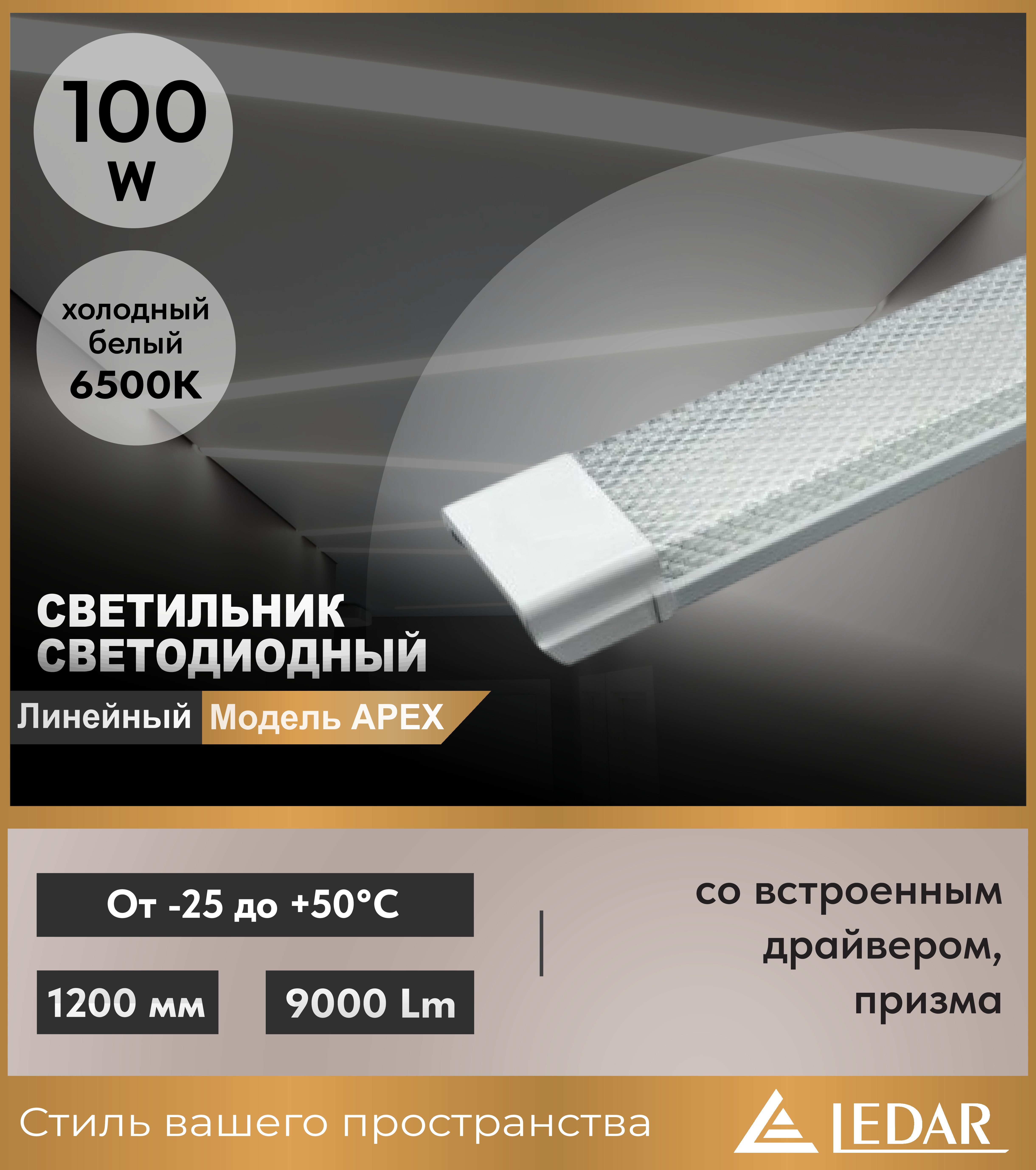 Светильник светодиодный линейный APEX 100W 6500K 1200мм со встроенным драйвером, призма, белый LEDAR