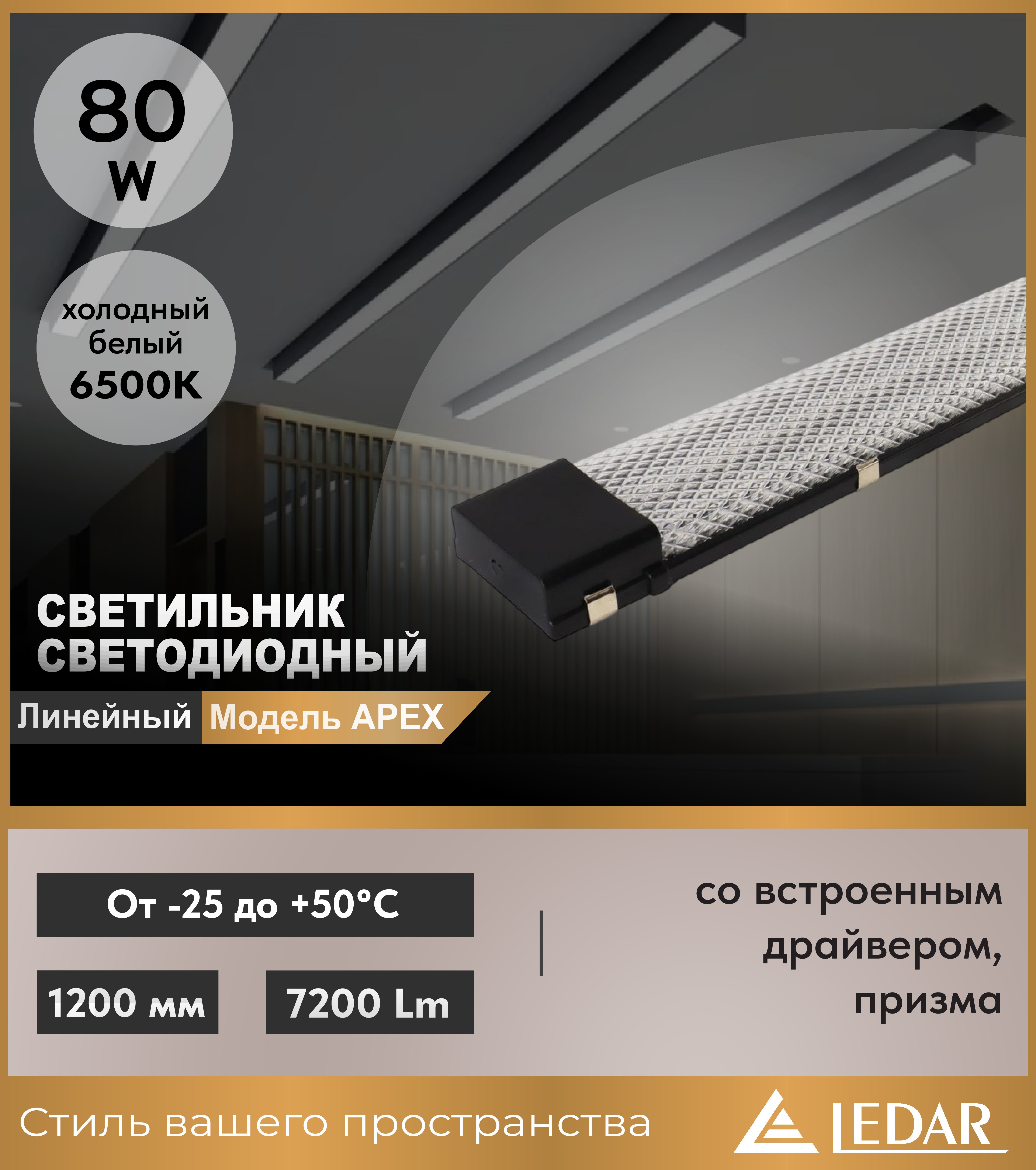 Светильник светодиодный линейный APEX 80W 6500K 1200мм со встроенным драйвером, призма, черный LEDAR