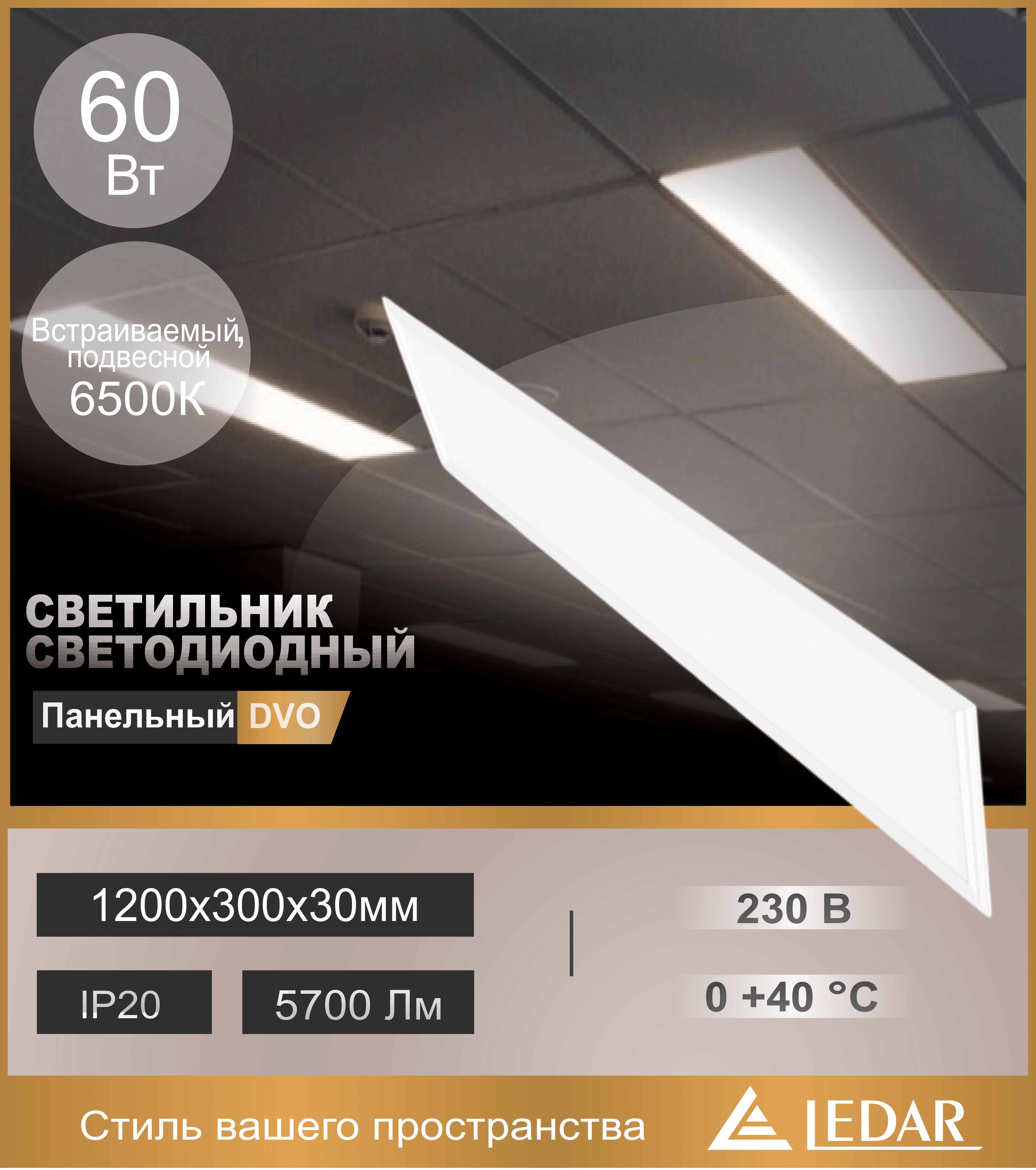 Светильник светодиодный панельный ДВО 60W 6500K 1200х300х30мм со встроенным драйвером, встраиваемый/подвесной, алюминиевая рамка, белый LEDAR