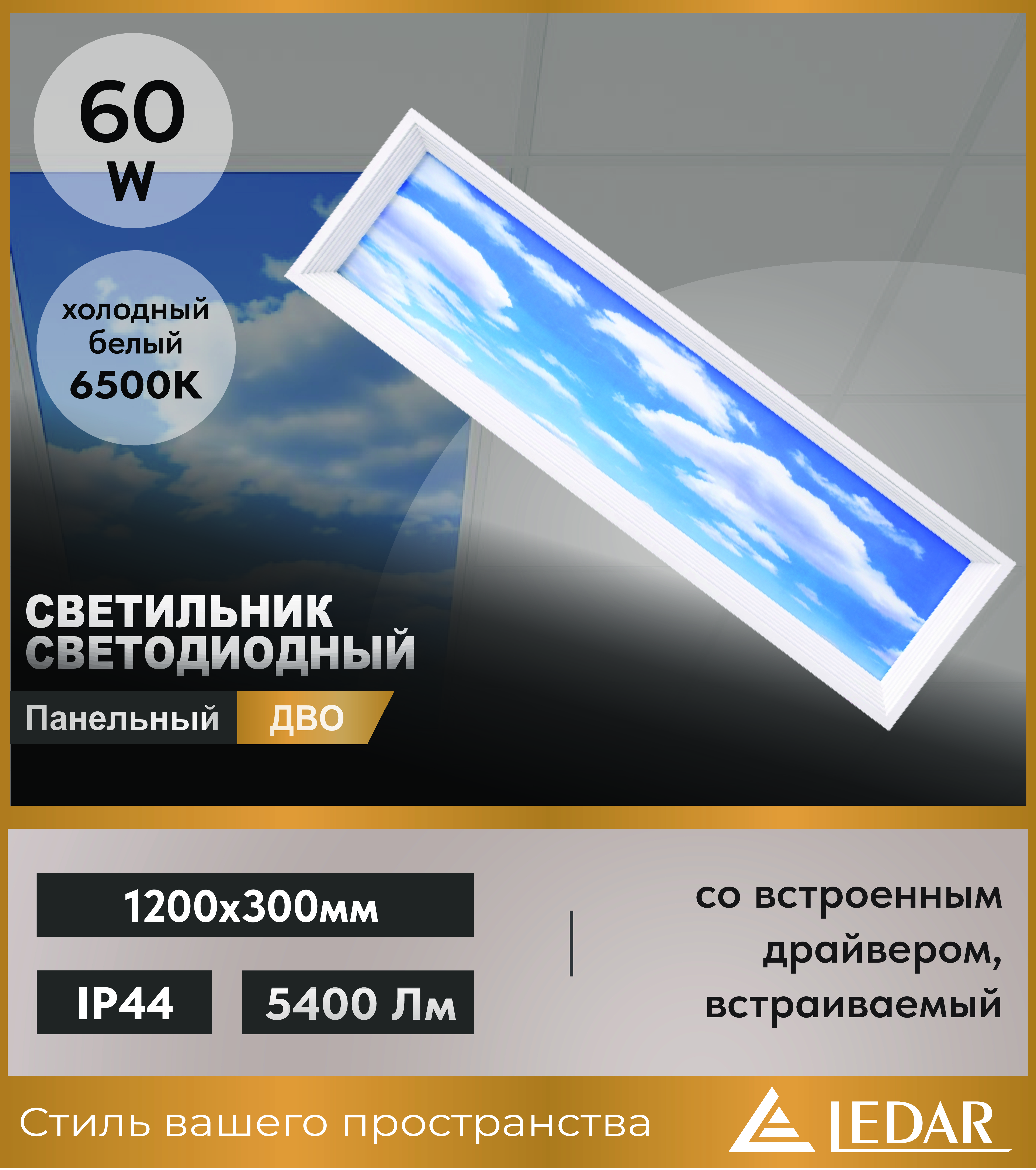 Светильник светодиодный панельный ДВО 60W ОБЛАКО 6500K 1200х300 со встроенным драйвером, встраиваемый, алюминиевая рамка, белый LEDAR