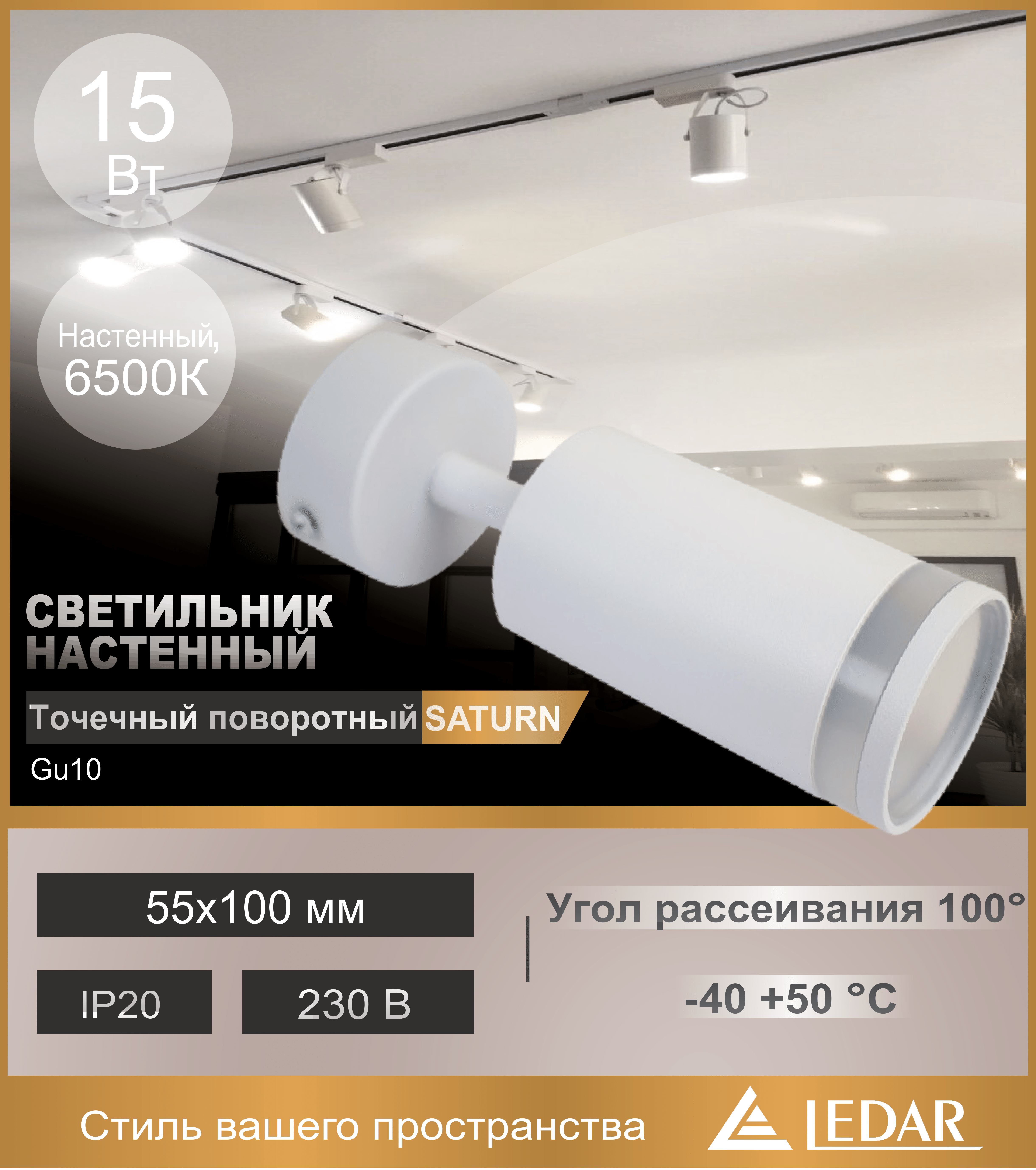 Светильник точечный поворотный для организации акцентной подсветки серии SATURN со сменной лампой типа GU10, белый, металл, защита IP20, угол рассеивания 100°, питание 230 В, 50 Гц, максимальная мощность источника света 15Вт, диапазон рабочих температур -40 ... +50 °C, размер 55х100мм, алюминиевый с акрилом, торговой марки LEDAR®