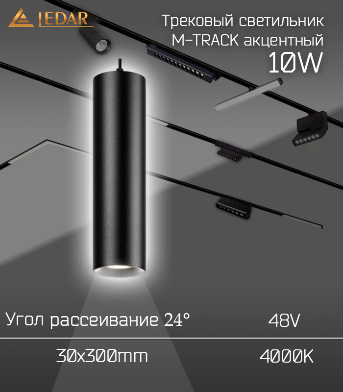 Точечный трековый светильник для магнитного шинопровода серии M-TRACK акцентный, мощностью 10W, на напряжение 48V, цветовая температура 4000K, индекс цветопередачи RA≥90, угол рассеивания 15/24°, черный, размером 30х300мм, торговой марки LEDAR®
