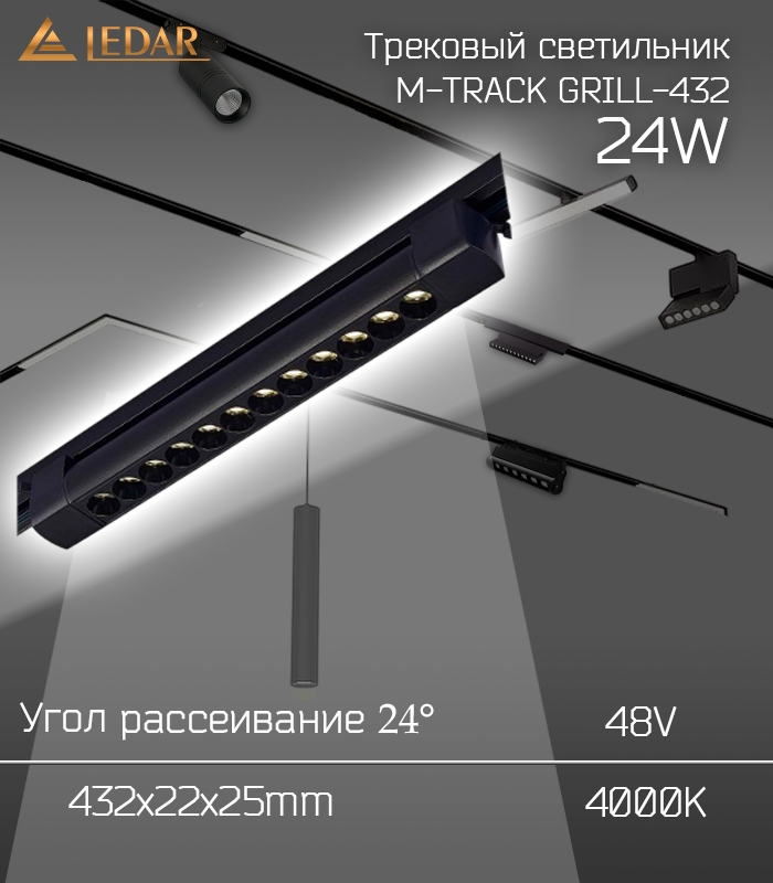Встроенный трековый светильник для магнитного шинопровода серии M-TRACK серии GRILL-432, мощностью 24W, на напряжение 48V, цветовая температура 4000K, индекс цветопередачи RA≥90, угол рассеивания 24°, черный, размером 432х22х25мм, торговой марки LEDAR®